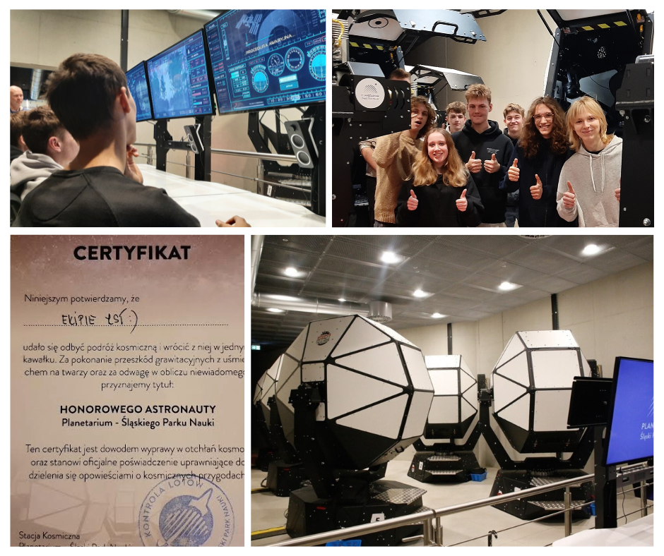 W minionym tygodniu 9 osób z naszej szkoły wzięło udział w Śląskim Parku Nauki w ciekawej lekcji dotyczącej astronomii. Oprócz obserwacji lotu na specjalnie przygotowanych stanowiskach, można było skorzystać z jednoosobowych kapsuł, wyposażonych w fotele na siłownikach, które poruszają się we wszystkich kierunkach, synchronizując ruchy z obrazem VR. W ramach wirtualnej podróży udało nam się dolecieć do Międzynarodowej Stacji Kosmicznej i następnie z niej wrócić w ciągu zaledwie 5 minut. Ciekawe przygoda, szczególnie kiedy w trakcie lotu, cała ekipa ZST łącznie z nauczycielką wisiała przez moment do góry nogami, utrzymując się jedynie na pasach bezpieczeństwa:)