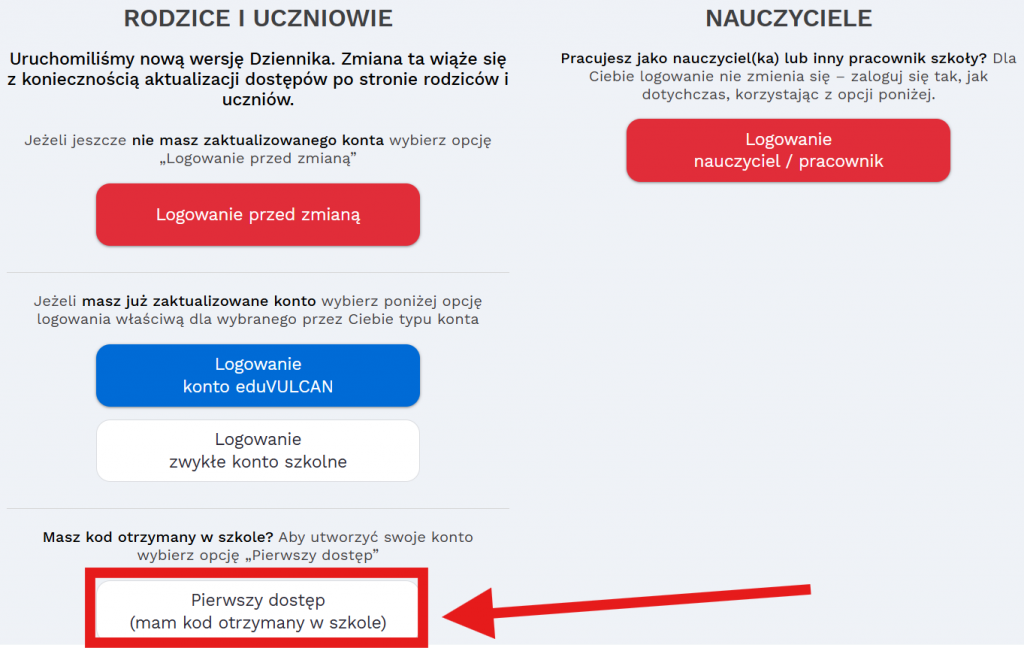 Logując się po raz pierwszy wybieramy opcję „Pierwszy dostęp”